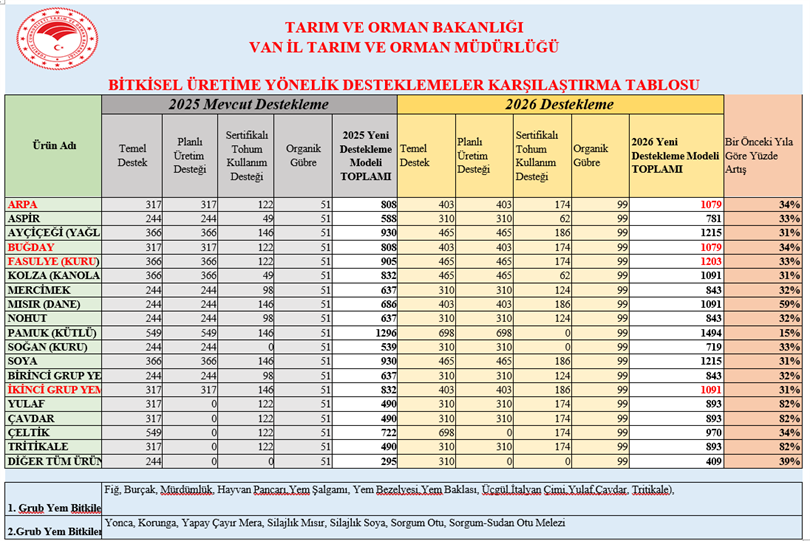 BİTKİSEL ÜRETİME YÖNELİK DESTEKLEMELER KARŞILAŞTIRMA TABLOSU